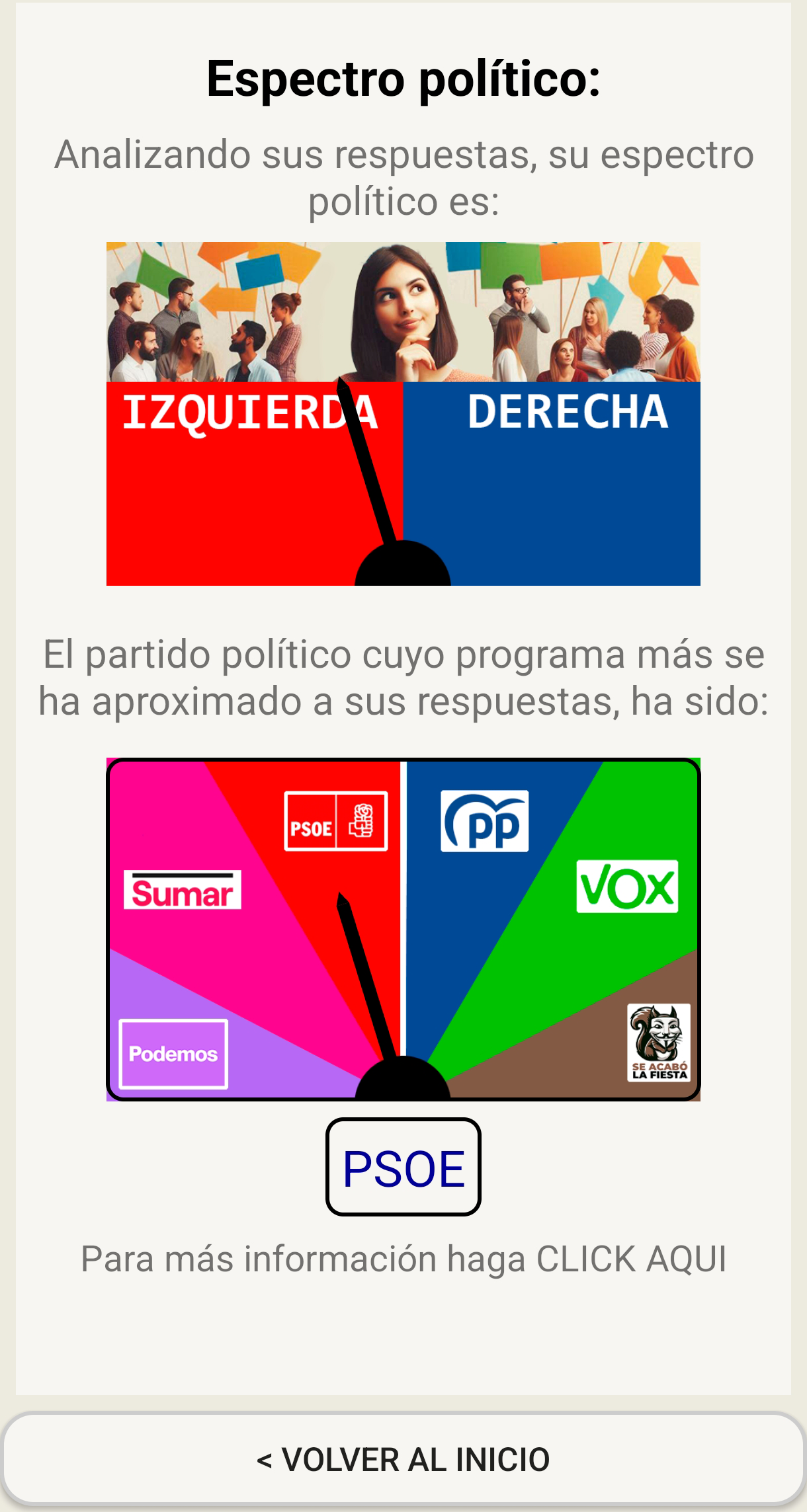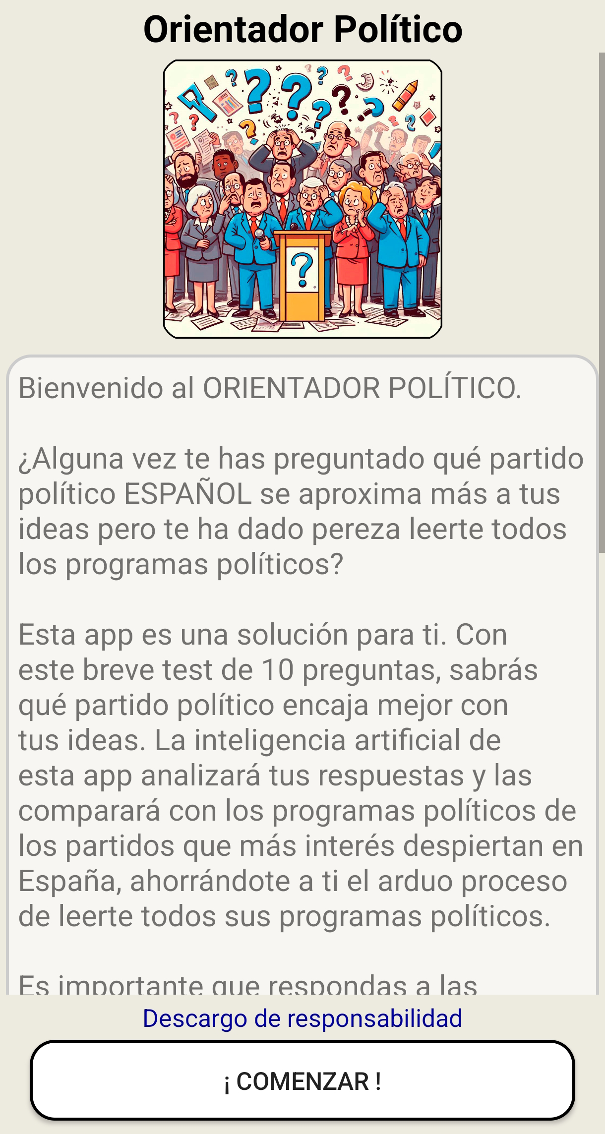 donde queremos ayudar a las personas a que sepan qué partido político es el que más se acerca a sus convicciones por medio de 10 sencillas preguntas. Es una app orientada a viralización con financiación a través de banners publicitarios.